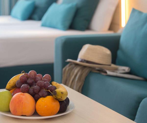 The Junior suites are comfortable and stylish, with a capacity for between 2 and 4 people and 26 square meters of space. They are equipped with cold-hot air conditioning, Wi-Fi, a phone, a safe (for a charge), SAT TV, a bathroom with a shower, toiletries, a hair dryer, a double sofa bed (for two people to share) and a balcony.